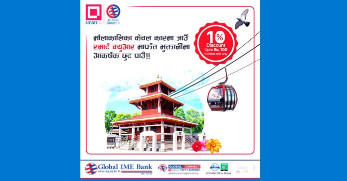 काठमाडौं := ग्लोबल आइएमई बैंकले नवलपुर जिल्लाको गैंडाकोटमा रहेको मौलाकालीका केबलकारको टिकट खरिदमा १० प्रतिशत छुट अफर ल्याएको छ । योजनाअन्तर्गत बैंकको मोबाइल एप ग्लोबल स्मार्ट प्लस प्रयोगकर्ताले स्मार्ट क्युआरबाट भुक्तानी गर्दा टिकट खरिदमा १० प्रतिशतसम्म छुट पाउनेछन्।