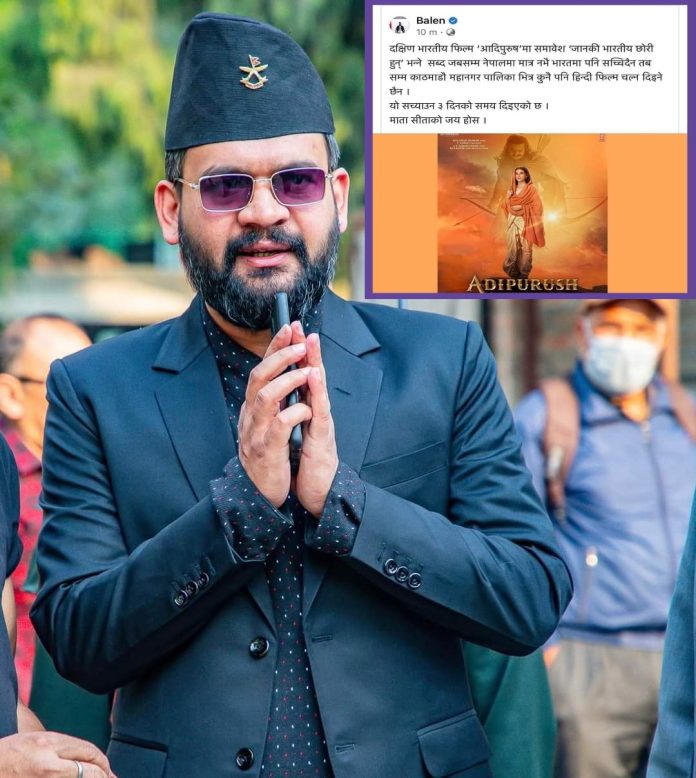 काठमाडौँ:= काठमाडौँ महानगरपालिकाका मेयर बालेन्द्र साह (बालेन) ले दक्षिण भारतीय चलचित्र ‘आदिपुरुष’ मा राखिएको ‘जानकी भारतीय छोरी हुन्’ भन्ने शब्द नहटाए महानगरभित्र कुनै पनि हिन्दी चलचित्र चल्न नदिने घोषणा गरेका छन् ।सामाजिक सञ्जाल फेसबुकमा पोस्ट गर्दै मेयर बालेनले चलचित्रमा समावेश उक्त शब्द नेपालमा मात्र नभई भारतमा पनि सच्चिनुपर्ने अडान लिएका छन् ।
