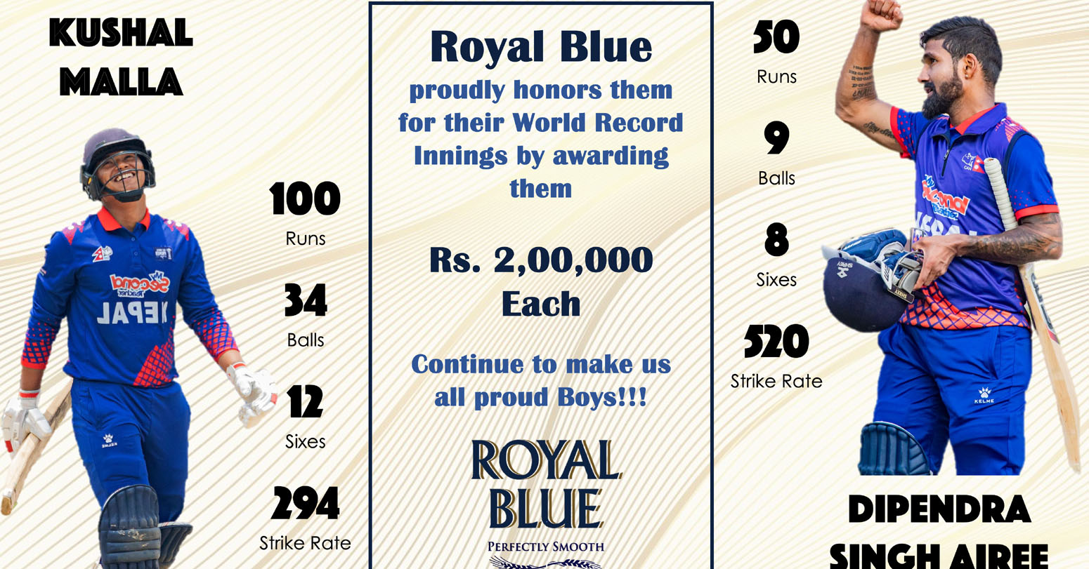 रोयल ब्लुका ब्राण्ड हेड ऋतिक शाहीले विज्ञप्तिमार्फत् भन्नुभएको छ, ‘कुशल र दीपेन्द्रले क्रिकेट मैदानमा गरेको असाधारण उपलब्धिका लागि हामी अत्यन्तै गर्व गर्छौँ । उनीहरूको उल्लेखनीय प्रदर्शनले नेपालको महिमा मात्र भएको छैन, क्रिकेटका उत्साहीहरूको एक पुस्तालाई पनि प्रेरित गरेको छ । पूर्णता र उत्कृष्टतामा समर्पित ब्राण्डका रूपमा रोयल ब्लु उनीहरूको उत्कृष्ट रेकर्डलाई सम्मान गर्न पाउँदा खुसी छ ।’