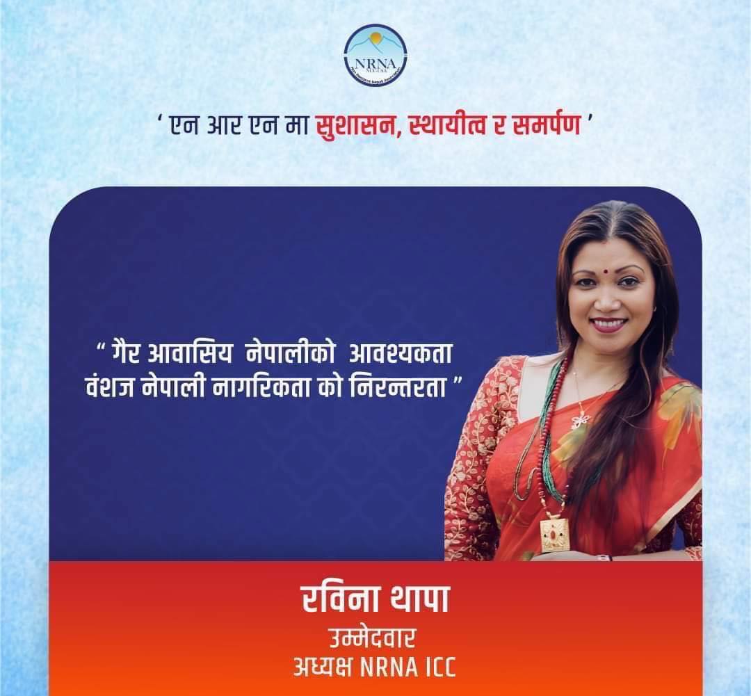 काठमाडौं := गैरआवासीय नेपाली सङ्घ (एनआरएनए आइसीसी) अध्यक्ष रविना थापाले सङ्घको आसन्न ११ औँ महाधिवेशनका लागि पुनःअध्यक्ष पदमा उम्मेदवारी घोषणा गरेकी छन् ।