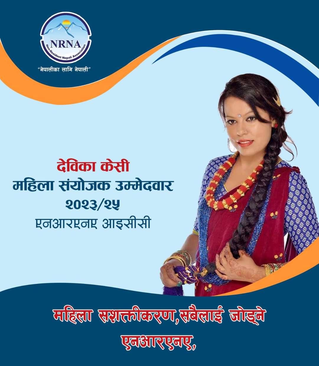 क्यानडा:= गैर आवासीय नेपाली संघ(एनआरएनए)को अक्टोवर महिनामा हुने ११औं महाधिवेशनमा चर्चित लोक गायिका देविका केसीले महिला संयोजक पदमा उम्मेदवारी घोषणा गरेकि छन ।