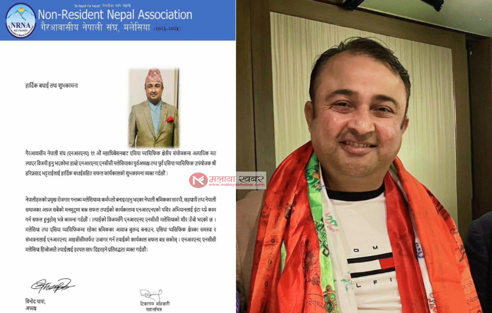 क्वालालम्पुर( मलेसिया ):= गैर आवासीय नेपाली संघ (एनआरएनए) आईसिसिको ११औं महाअधिवेशनबाट एसिया प्यासिफिक क्षेत्रीय संयोजक आर.सि. पदमा निर्वाचित हरि प्रसाद भट्टराईलाई गैर आवासीय नेपाली संघ (एनआरएनए) एनसिसि मलेसियाले बधाई तथा शुभकामना व्यक्त गरेका छ्न ।