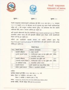साथै कन्सुलर सेवा लिन आउनेहरु लाई कुनै किसिमको अप्ठ्यारो समस्या भएमा दूतावासको कर्मचारी बहादुर थापाको मोबाईल नम्बर +६०१६६०१३०६५ मा सम्पर्क गर्न सकिनेछ् ।