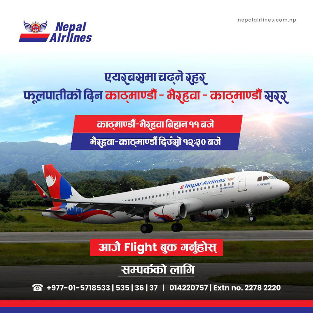 काठमाडौं := नेपाल एयर लाइन्सले फूलपातीको दिन काठमाडौँ-भैरहवा-काठमाडौँ उडान गर्ने भएको छ । अहिले चाडपर्व र सडक अवरुद्ध बनेको समयमा हवाई क्षेत्रमा यात्रूको छाप बढेपछि नेपाल एयर लाइन्सले काठमाडौँ भैरहवा उडान गर्ने भएको हो ।