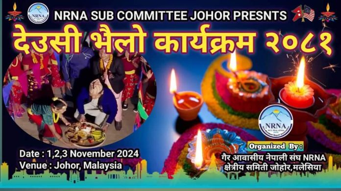 क्वालालम्पुर (मलेसिया):= गैर आवासीय नेपाली सघं “एनआरएनए” क्षेत्रीय समिति जोहरबारुले हिन्दूहरुको दोस्रो ठूलो महानचाडपर्व शुभ दीपावलीको पावन अवसरमा देउसी भैलो कार्यक्रम आयोजना गर्ने भएको छ ।
