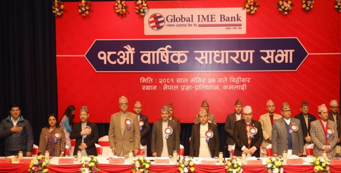 क्वालालम्पुर := ग्लोबल आइएमई बैंक लिमिटेडको १८औँ वार्षिक साधारणसभा बिहीबार काठमाडौँमा सम्पन्न भएको छ । साधारणसभाले आर्थिक वर्ष २०८०।८१ को सञ्चित मुनाफा तथा पुँजी समायोजन कोष समेतबाट बैंकले आफ्ना शेयरधनीहरूलाई प्रस्ताव गरेको ५.५ प्रतिशत बोनस शेयर लाभांश दिने प्रस्तावलाई सर्वसम्मतिले पारित गरेको छ ।