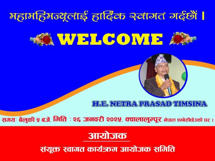क्वालालम्पुर (मलेसिया):= मलेसियामा सक्रिय विभिन्न सामाजिक , राजनीतिक संघसंस्था , ब्यापारी , ब्यावसायी , सञ्चारकर्मी मिलेर संयुक्त रुपमा मलेसियाका लागि नव नियुक्त राजदूत महामहिम डा.नेत्रप्रसाद तिम्सिनाको स्वागत गर्ने भएको छ ।