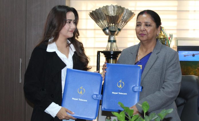 नेपाल टेलिकमको केन्द्रीय कार्यालयमा सोमबार आयोजित एक कार्यक्रमबीच सोसम्बन्धी सम्झौतापत्रमा नेपाल टेलिकमकी प्रबन्ध निर्देशक संगीता पहाडी (अर्याल) र कलाकार खड्काले हस्ताक्षर गर्नुभएको हो ।