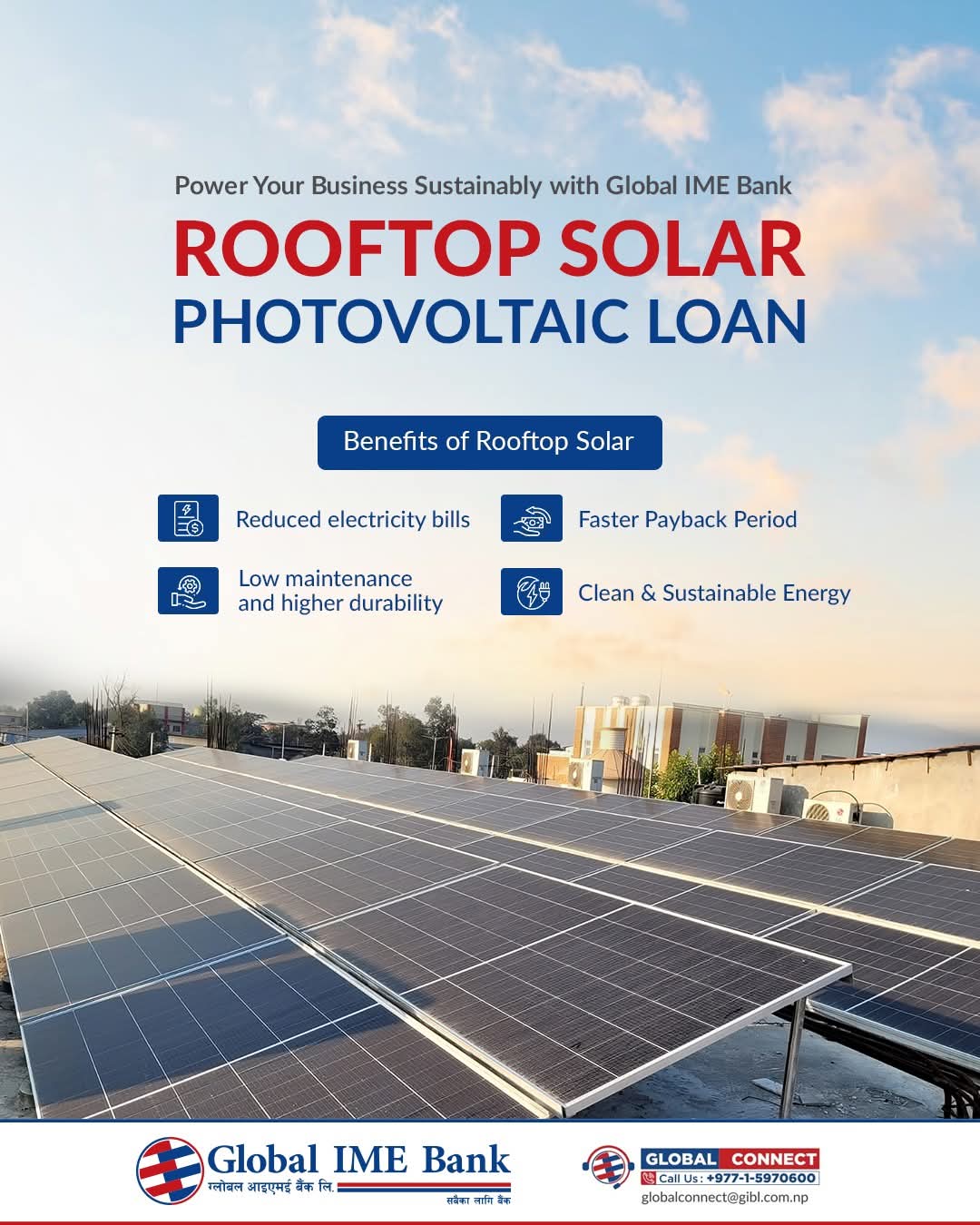 काठमाडौं := ग्लोबल आइएमई बैंकले पृथ्वी दिवसका अवसरमा औद्योगिक र व्यावसायिक भवनमा सोलार सिस्टम जडानलाई प्रोत्साहन गर्न रूफटप सोलार कर्जा योजना सार्वजनिक गरेको छ । कर्जाका मुख्य उद्देश्यहरू नवीकरणीय ऊर्जाको पहुँच विस्तार गर्ने, जलविद्युत् ऊर्जा आपूर्तिमा निर्भरता घटाउँदै ऊर्जा सुरक्षा सुनिश्चित गर्ने र ऊर्जा खपत कम गर्दै वातावरणीय प्रभाव न्यूनीकरण गर्ने रहेका छन् ।