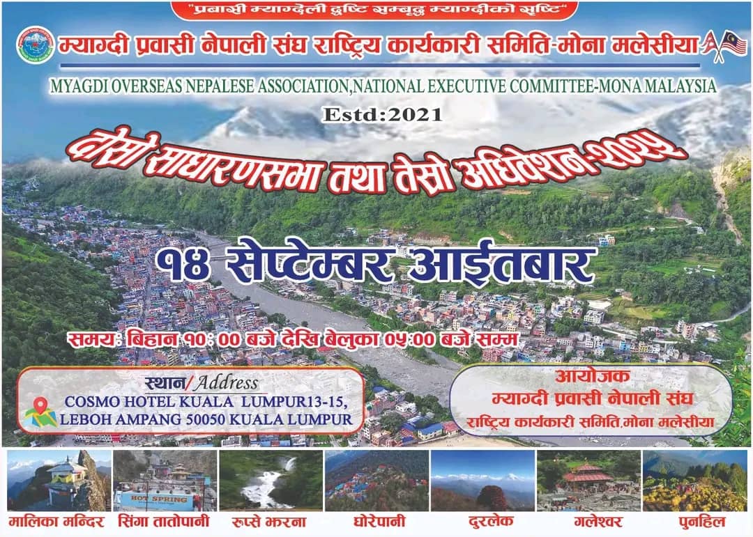 क्वालालम्पुर (मलेसिया):= म्याग्दी प्रवासी नेपाली संघ राष्ट्रिय कार्यकारी समिति – मोना मलेशियाले आफ्नो दोस्रो साधारण सभा तथा तेस्रो अधिवेशन कार्यक्रम आयोजना गर्ने भएको छ ।