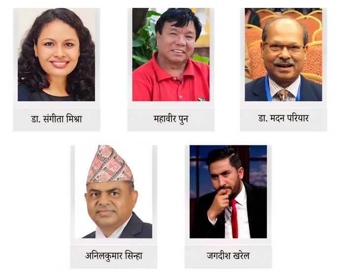 काठमाडौं:= अन्तरिम सरकारका प्रधानमन्त्री सुशीला कार्की ले ५ मन्त्रीको नाम सिफारिस गरेर राष्ट्रपति कार्यालयमा पठाएकी छन् । कार्कीले सर्वोच्च अदालतका पूर्वन्यायाधीश अनिलकुमार सिन्हा, वैज्ञानिक महावीर पुन, पत्रकार जगदीश खरेल, स्वास्थ्य मन्त्रालयकी निवर्तमान अतिरिक्त सचिव संगीता मिश्रा, विकासविद् मदन परियारलाई मन्त्रीको नाम सिफारिस गरेकी छन् । प्रधानमन्त्री कार्कीले जेनजी युवाहरूसँग समन्वय गर्दै मन्त्री छनोट गरेकी हुन् ।