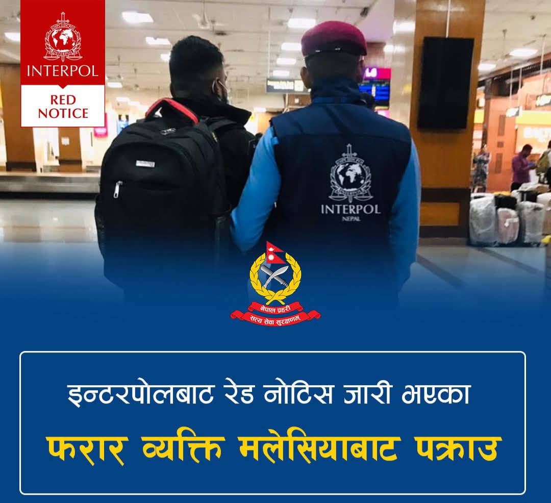 काठमाडौं:= ठगी तथा संगठित अपराध मुद्दामा इन्टरपोलबाट रेड नोटिस जारी भएका फरार प्रतिवादी रौतहट कटहरिया नगरपालिका-१ ठेगाना भएका आकाश प्रसाद कुशवाहा मलेसियामा पक्राउ परेका छन्।