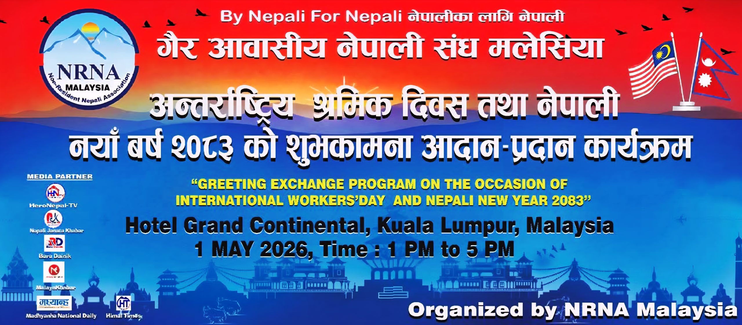 क्वालालम्पुर := गैर आवासीय नेपाली संघ (एनआरएनए) मलेसियाले अन्तर्राष्ट्रिय श्रमिक दिवस तथा नेपाली नयाँ वर्ष २०८३ को अवसर पारेर विशेष शुभकामना आदानप्रदान कार्यक्रम आयोजना गर्ने भएको छ ।