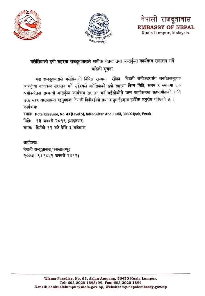 नेपालि राज्दुताबास क्वालालम्पुर मलेसियाले आजै एक सुचना सार्वजनिक गर्दै इपो आसपासमा रहेका नेपाली कामदार लाई उक्त कार्यक्रममा सहभागी हुन अनुरोध समेत गरेको छ । कार्यक्रम मा एक तर्फी यात्रा अनुमतीपत्र राहदानी नवीकरण फारम बितरण हुनुका साथै जेल तथा डिटेन्सन क्याम्पमा रहेका नेपाली हरुको बारे जानकारी तथा अन्य समस्या र तिन्का समाधानका बिसयमा छलफल हुने भएको छ ।