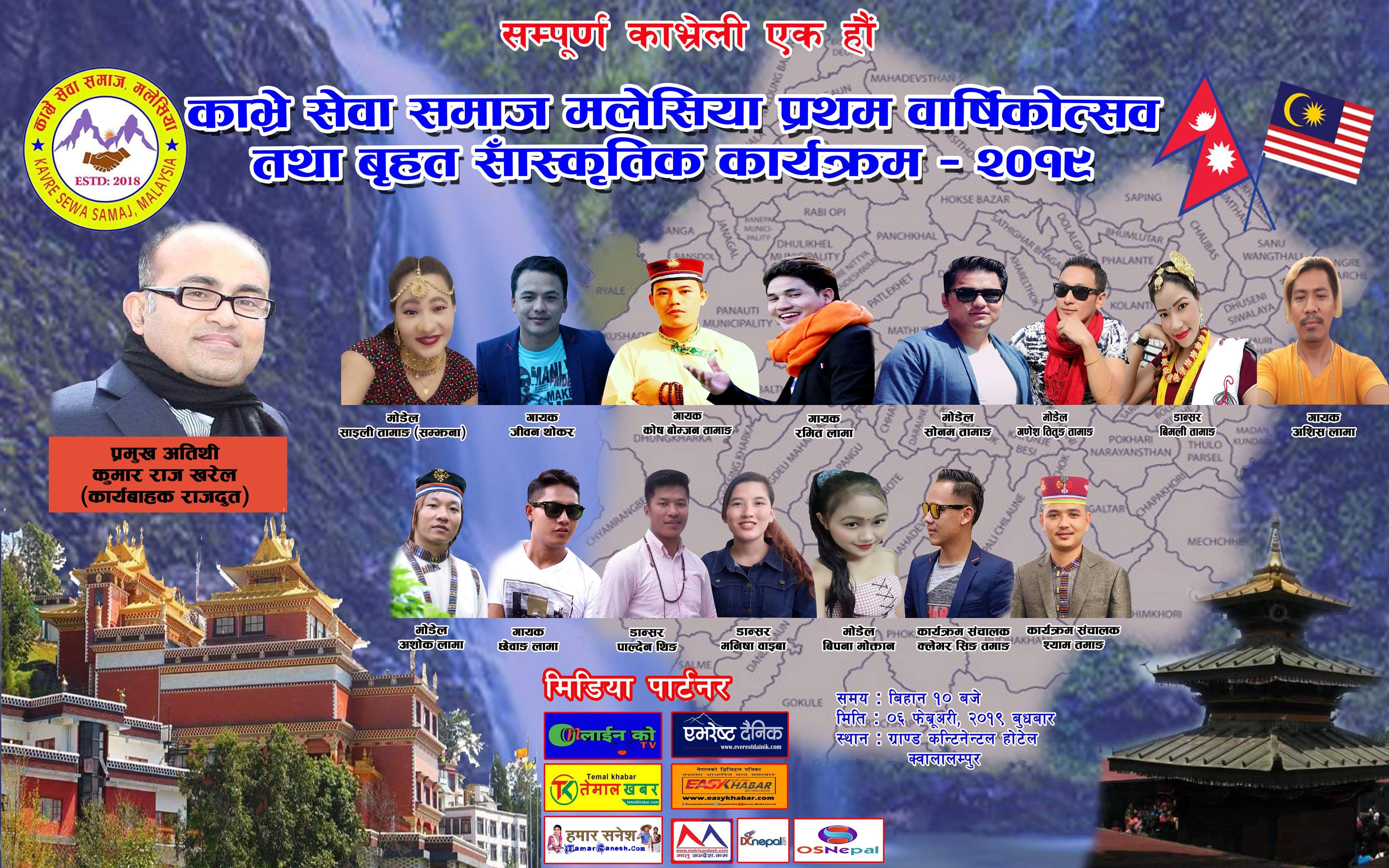 क्वालालम्पुर – “सम्पुर्ण काभ्रेली एक हौं ” भन्ने मुल नाराका साथ गठित काभ्रे सेवा समाज मलेसियाले विभिन्न संस्कृति कार्यक्रम गरी प्रथम वार्षिक उत्सव मनाउने भएको छ । प्रवासमा रहेका काभ्रेलीहरुले काभ्रे समग्र विकासका लागि गठन भएको हो । मलेसियाका लागि नेपाली कार्यबाहक राजदूतले कार्यक्रमलाई प्रमुख अतिथीको रुपमा संवोधन गर्ने कार्यक्रम रहेको छ ।