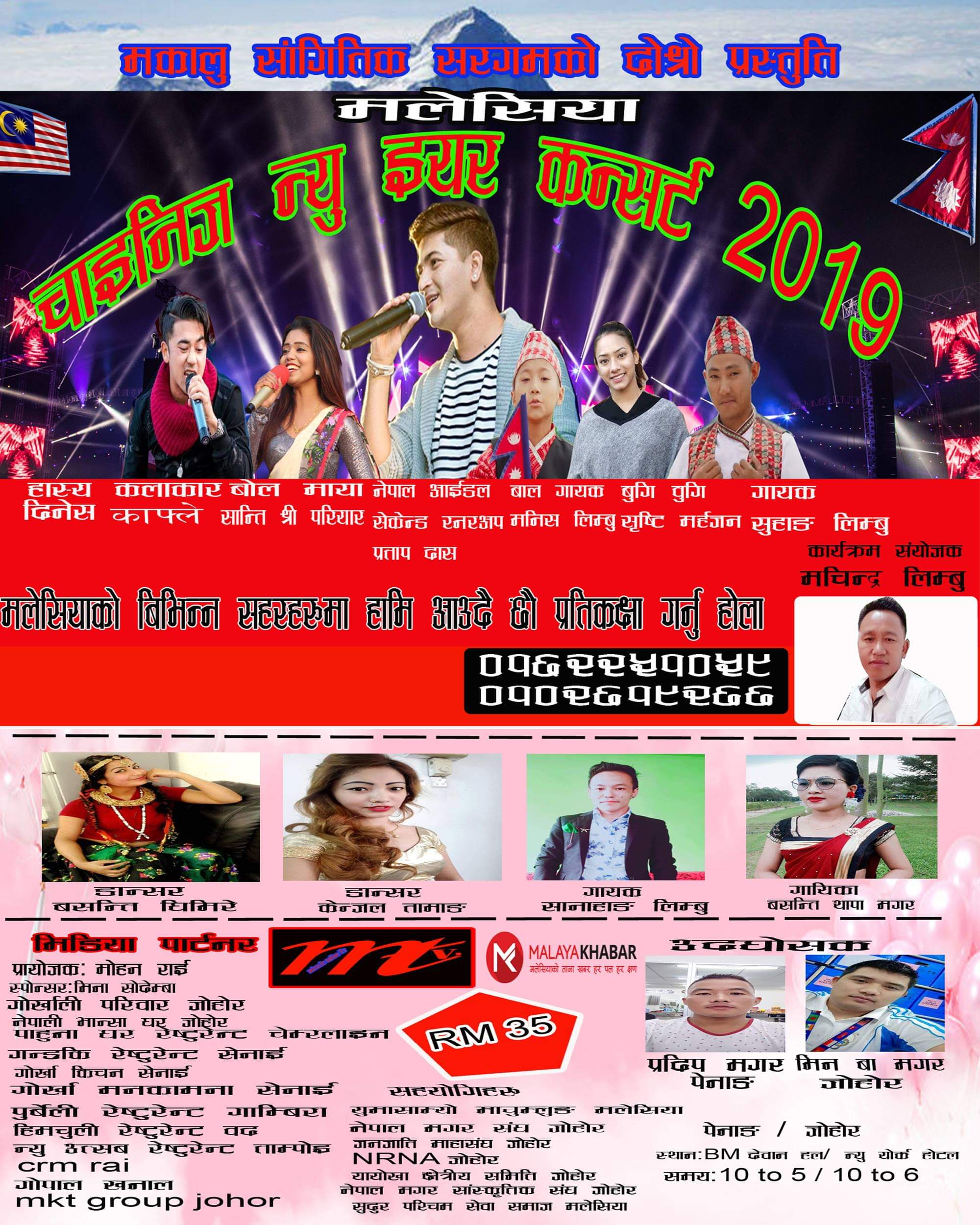 मोहन राईले प्रायोजन गरेको चाइनिज नयाँ बर्ष २०१९ को सम्योजक मचिन्द्र लिम्बू रहनुभएको छ । उक्त कन्सर्ट लाई मिना सोढेम्बा,गोर्खाली परिवार जोहोर,नेपाली भान्साघर जोहोर,पाहुना घर रेस्टुरेन्ट ,डाइनामिक रेस्टुरेन्ट ,गोर्खा किचन,गोर्खा मनकामना रेस्टुरेन्ट ,पुर्बेली रेस्टुरेन्ट ,हिम्चुली रेस्टुरेन्ट,न्यु उत्सब रेस्टुरेन्ट ,क्रम राई,गोपाल खनाल ,एम के टि ग्रुप जोहोरबारुले सहयोग गर्ने भएका छन।