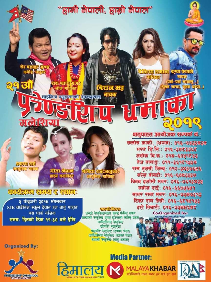 आगामी फेब्रुअरी ५ तारीख मंगलबारका दिन बातुपहाड SJK चाइनिज स्कुल देवान हल बातुपहाड बसपार्क नजिकै हुने उक्त कार्यक्रमको तयारि अन्तिम चरणमा पुगेको छ । कलाकार भिजा हल बुकिङ टिकट तथा कार्यक्रम हुने हल्मा लगाइने ब्यानर सबै तयारी अबस्थामा रहेको आयोजक कमिटिले जनकारी दिए।