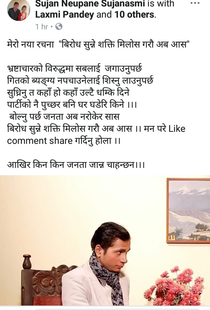 हास्यकलाकार सुजन न्यौपानेले अहिले ” लुट्न सके लुट कान्छा “बोलको गित सार्वजनिक गरेपस्चात सर्बाधिक चर्चामा रहेका लोक गायक पसुपती सर्मा लाई समर्थन गर्दै आफुले पनि आफ्नो कलाकै माध्यम बाट हास्यात्मक प्रस्तुति द्वारा ब्यतिथिको चर्को आवाज उठान गर्ने भएका छ्न ।
