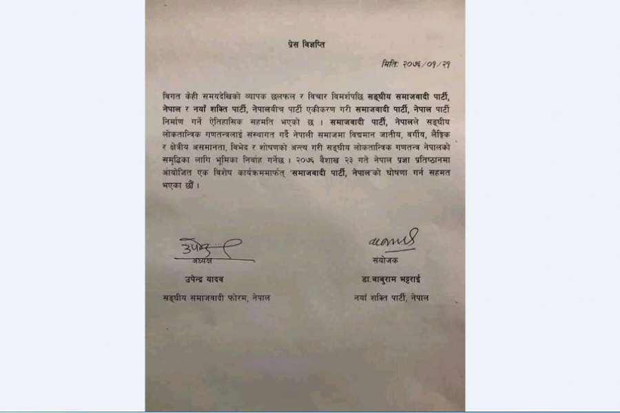 काठमाडौं । संघीय समाजवादी फोरम नेपाल र नयाँ शक्ति पार्टी नेपालबीच भोली एकता हुने भएको छ ।