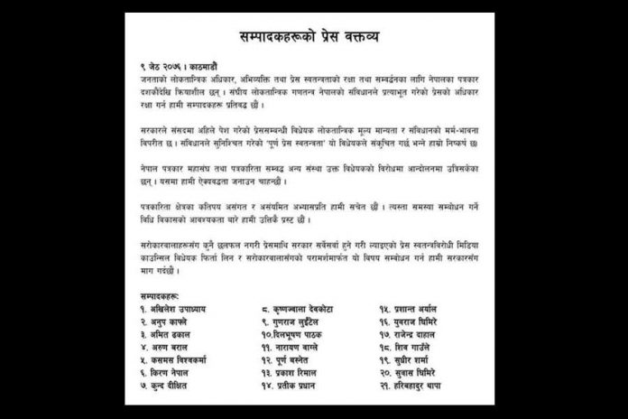 काठमाडौं । विभिन्न सञ्चारमाध्यमका सम्पादकहरूले मिडिया काउन्सिल विधेयक फिर्ता लिन माग गरेका छन् । बिहीबार २१ जना सम्पादकहरूले संयुक्त वक्तव्य जारी गरेर संविधानले सुनिश्चित गरेको पूर्ण प्रेस स्वतान्त्रताको विधेयकले संकुचित पार्ने निष्कर्ष निकाल्दै सरोकारवालासँग परामर्श नै नगरी ल्याइएको मिडिया काउन्सिल विधेयक फिर्ता लिन मग गरेका हुन् ।
