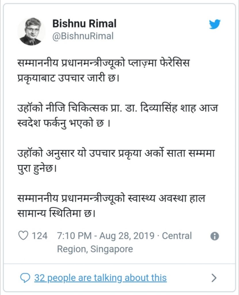 सामाजिक सञ्जाल ट्विटरमा ट्विट मार्फत रिमालले प्रधानमन्त्रीको उपचार प्रक्रिया पूरा हुन एक साता लाग्ने जनाएका छन् ।