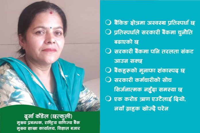 सरकारी बैंकहरू अब निजी बैंकजस्तै प्रतिस्पर्धाका लागि तयार रहन परम्परागत कार्यशैली र सोचबाट मुक्त हुनुपर्ने उनी बताउँछिन् । विगतमा नेपाल बैंकमा काम गरेकी कँडेल हाल नेपाल बैंकको प्रमुख कार्यकारी अधिकृत (सिइओ) को एकमात्र महिला प्रतिस्पर्धीसमेत रहेकी छन् । यिनै विविध विषयमा शाखा प्रबन्धक कँडेलसँग हिमालय टाइम्सका लेखनाथ पोखरेलले गरेको कुराकानी ः