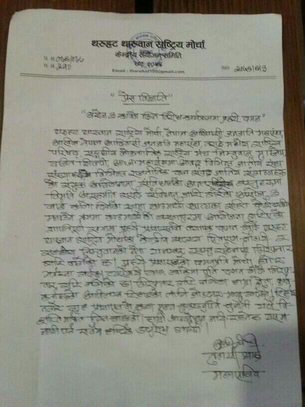 यता थरुहट थारुवान राष्ट्रिय मोर्चाले प्रेस बिज्ञप्ति जारी गरि पक्राउ परेका सिताराम थारु लाई छोड्न जोडदार मआग गरेका छ्न ।