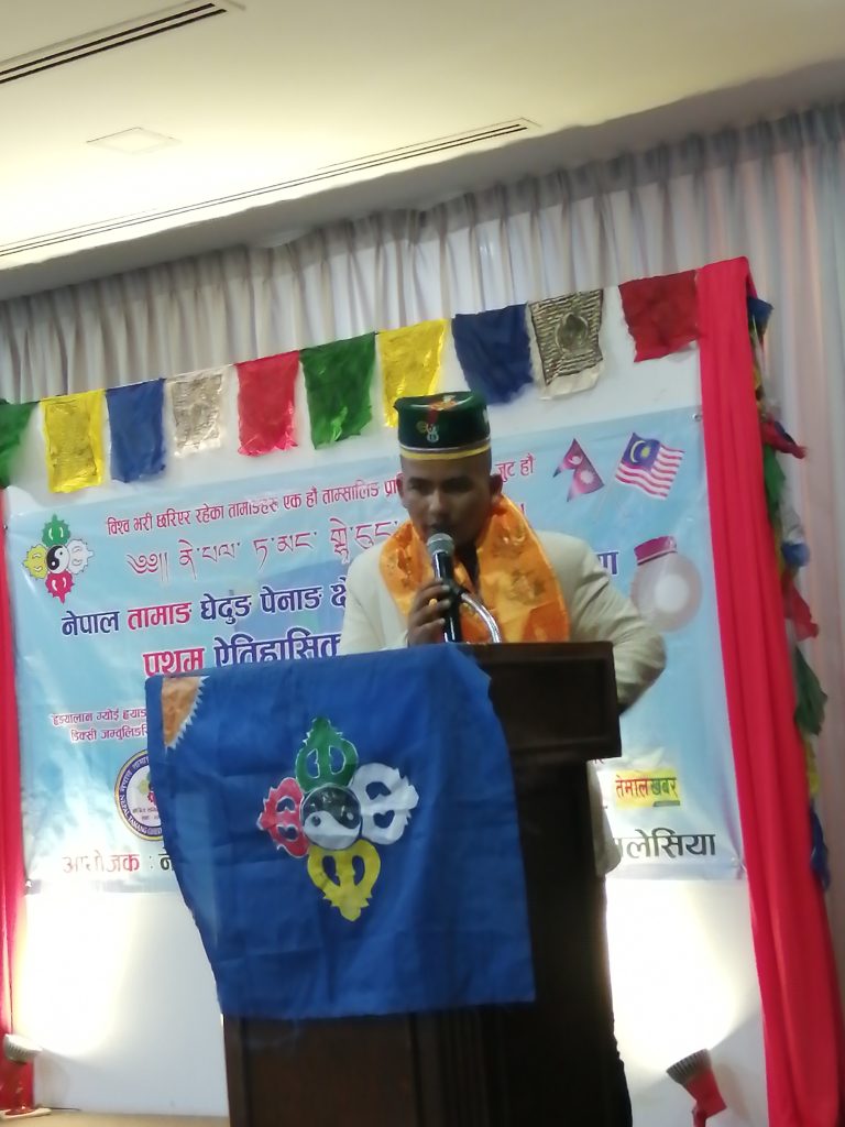 कार्यक्रमका प्रमुख अतिथि नेपाल तामाङ घेदुङ मलेसियाका केन्द्रीय अध्यक्ष राजेन्द्र वाईबा तामाङले नवनिर्वाचित टिमलाई शुभकामना दिए। “ह्यङ्लान ग्योई ह्यङ्लान काई जम्मान डिक्सी जम्वुलिङरिन छार्नालाई ” यस तामाङको नारालाई सम्बोधन गर्दै वाईबाले पहिचान, स्वतन्त्रता र समानुपातिक अधिकारको सवालमा हामीलाई जति पनि राज्य सात्तले तला परेका छ यस सावलमा तामाङ घेदुङ राज्यसँग निरन्तर लडिरहेको बताए । उनले थपे- हामी तामाङ घेदुङ कुनै नाफा कमाउनको लागि गठन गरेको संस्था होइन यो संस्थाबाट हामी नेपाल पुगेर नेता बन्छु भन्ने कुनै साथीको मनमा होला तर यो बिलकुलै नभए र हामी स्वतन्त्र बिशुद्दा मन देखि लाग्न सबैलाई आग्रह गरेका छन । २० मिनेट लामो कुरामा वाईबाले हाम्रो तामाङहरूमा खुट्टा तान्ने प्राविधि रहेको र यो प्रविधिलाई अन्त्य गर्न पनि अनुरोध गरेका छ । वाईबाले नयाँ बर्षा अर्थात मुख्य चाड भनेको ल्होछार रहेको र हामी तामाङले मनाउने ल्होछार मञ्जुश्री पात्रोमा रहेको सोनाम ल्होछार तामाङ रहेको र हामीले ल्होसारलाई प्राथमिकताका साथ मनाउन अनुरोध पनि गर्नु भएको छ ।