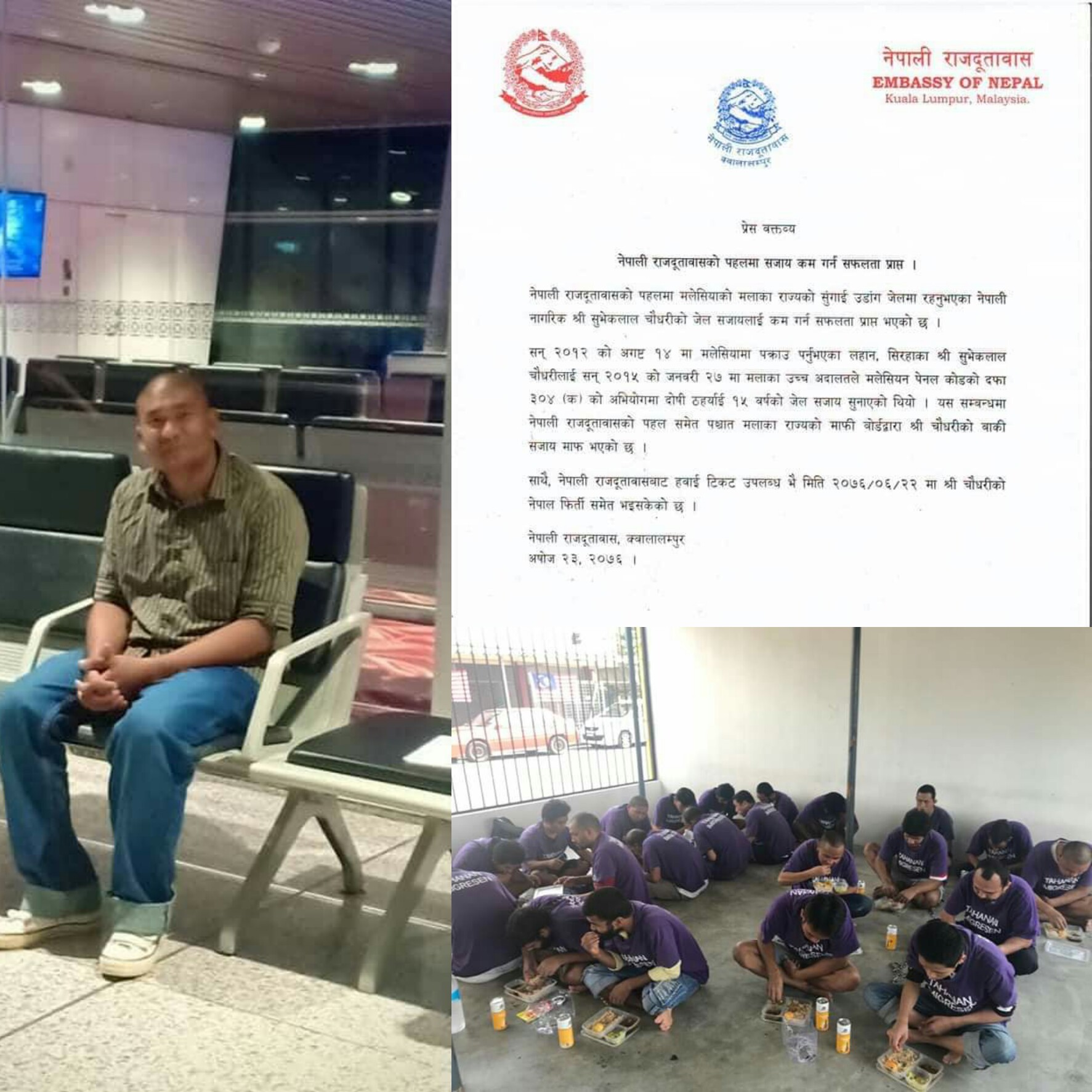 क्वालालम्पुर (मलेसिया):= नेपाली राजदुतावास मलेसियाको पहलमा एक जना नेपालीको जेल सजाय कम गराई माफी दिलाई स्वदेश फर्कन सफल भएका छ्न ।