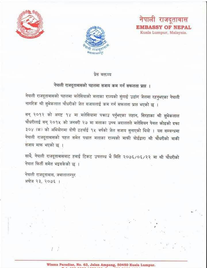 मलेसियाको मलाका राज्यमा अवस्थित सुँङ्गाइ उडांङ जेलमा रहनु भएका नेपाली नागरिक सुभेकलाल चौधरीको जेल सजाय कम गराउन नेपाली राजदुतावास सफल भएको दूतावास द्वारा बिहिवार जारी गरिएको प्रेस बिज्ञप्तीमा उल्लेख छ्न ।सन २०१२ को अगष्ट १४ तारिखमा मलेसियामा पक्राउ पर्नु भएको नेपाल ठेगाना सिरहा जिल्ला लहान निवासी सुभेकलाल चौधरीलाई सन २०१५ को जनवरी २७ मा मलाका उच्च अदालतले मलेसियन पेनल कोडको दफा ३०४ (क)को अभियोगमा दोषि ठहराई १५ बर्षको जेल सजाय सुनाएको थियो । यसै सन्दर्भमा नेपाली राजदुतावासको पहल पश्चात् मलाका राज्यको माफी बोर्ड द्वारा चौधरीको बाकी ११ बर्षको सजाय माफ भएको हो ।
