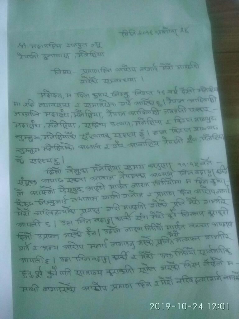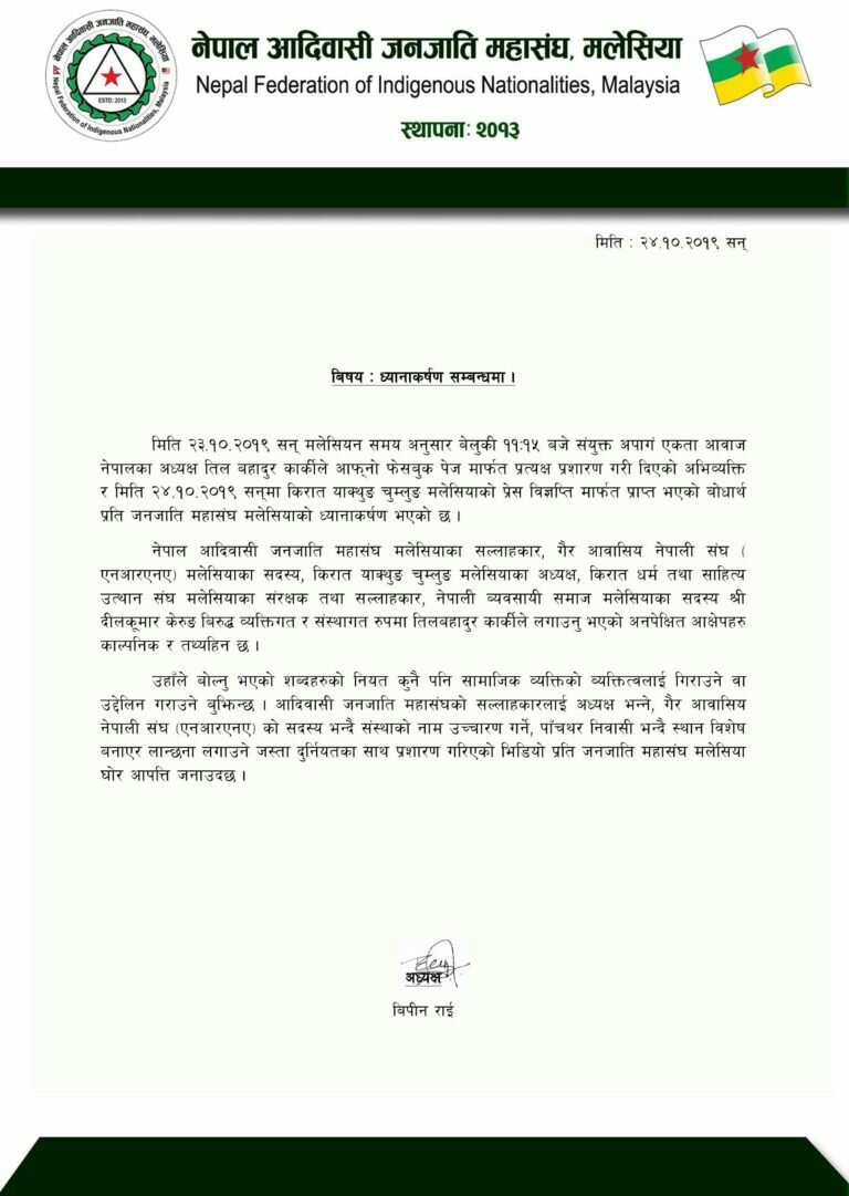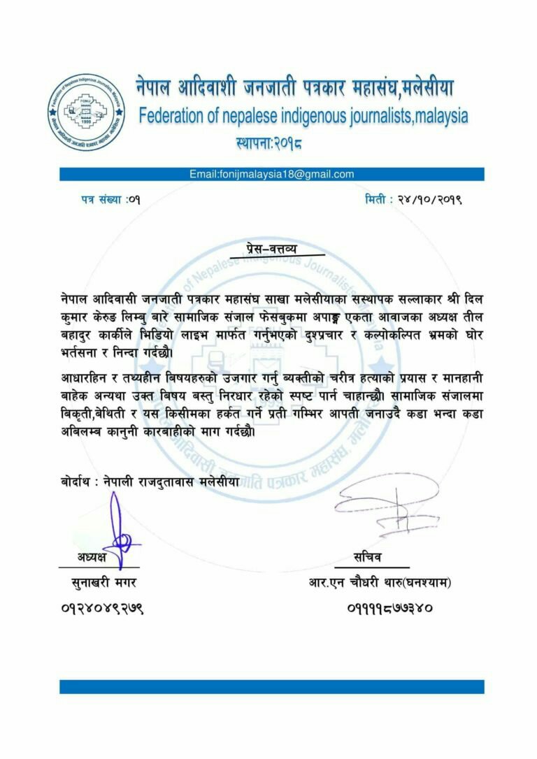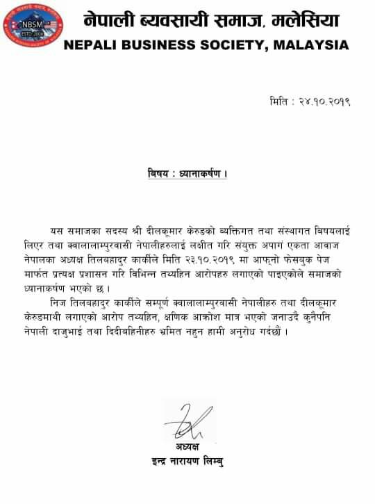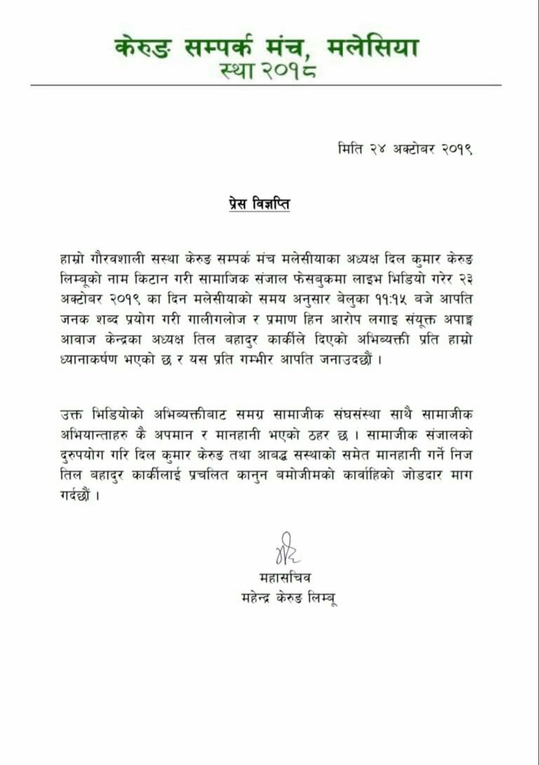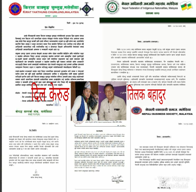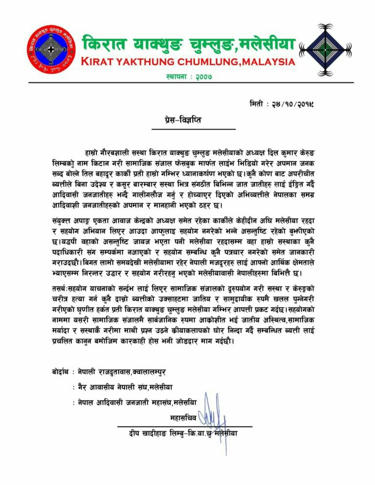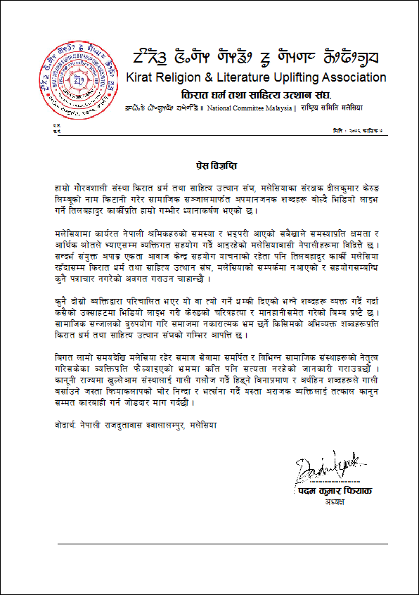 क्वालालम्पुर (मलेसिया):= बुधबार साझ संयुक्त अपाङ्ग एकता आवाज केन्द्रका अध्यक्ष समाजसेवी ब्याक्तित्व रुपमा चिनिने तिल बहादुर कार्कीले सामाजिक संजाल फेसबुक लाईभ भिडियो मार्फत तथानाम गालिगलोज र तथ्य हिन आरोप लगाई किरात याक्थुङ चुमलुङ मलेसियाका बर्तमान अध्यक्ष दिल कुमार केरुङ लिम्बुको चिरत्र हत्या गरेको भन्दै मलेसियामा सञ्चालित विभिन्न संघसंस्थाले प्रेस विज्ञप्ति जारी गरेको छ।