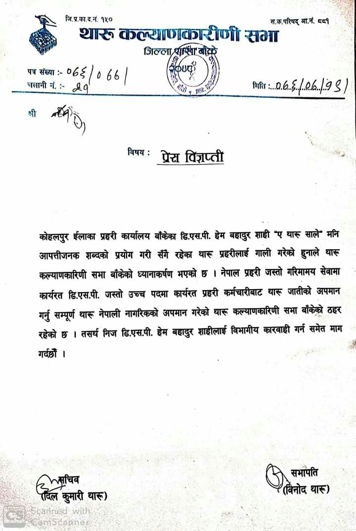 डिएसपी शाहीले एक घटनाको छानबिनको क्रममा एक प्रहरीलाई एकदमै निच शब्द ” मा……ने ,साले थारु ” भन्ने शब्द प्रयोग गरि नेपालका आदिवासी भुमीपुत्र सिङ्गो थारु जातीलाईनै अङ्कित गर्दै गाली गरेको प्रती थारु कल्याणकारीणि सभा जिल्ला शाखा बाकेको ध्यानाकर्षण भएको भन्दै सभाले मंगलबार एक प्रेस बिज्ञप्ति जारी गरि डिएसपीलाई बिभागीय कारवाहीको जोडदार माग गरेको छ ।