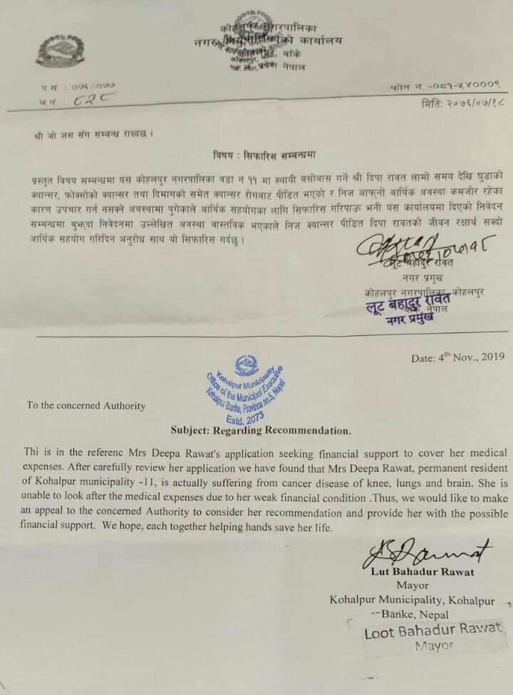 घुडाको क्यान्सर,फोक्सोको क्यान्सर,दिमागको क्यान्सर बाट ग्रसित दिपा रावत यति बेला नेपाल् क्यान्सर अस्पताल हरिसिद्धि काठमाडौमा उपचारार्थ रहेकी छिन ।
