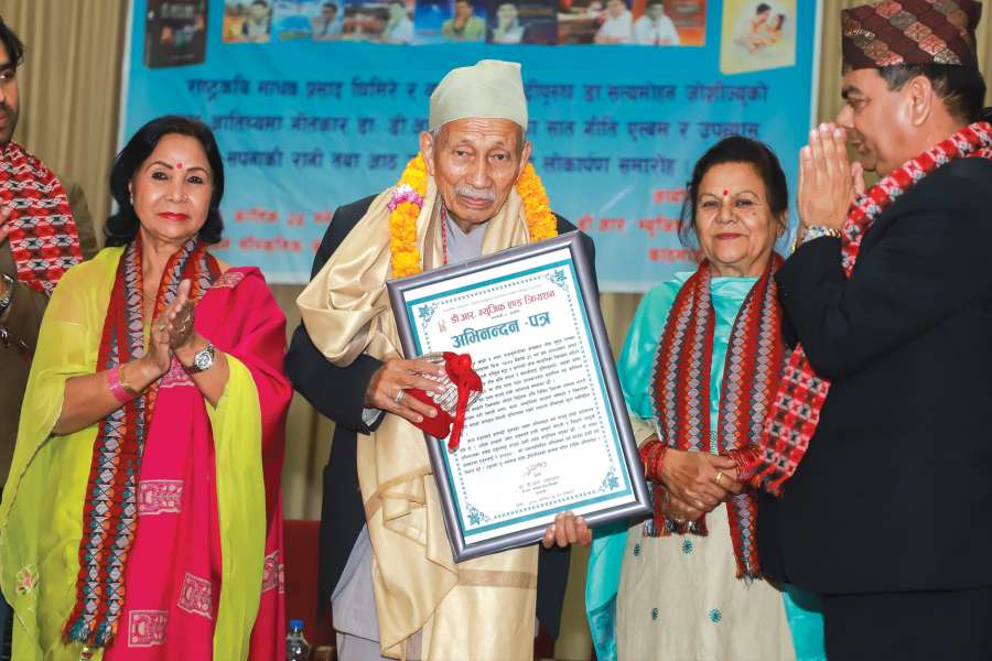 काठमाडौं । बाङ्मय शताब्दी पुरुष सत्यमोहन जोशी र राष्ट्रकवि माधवप्रसाद घिमिरेलाई सम्मान गरिएको छ । जोशीलाई ‘जन्मसताब्दी अभिनन्दन २०७६’ र घिमिरेलाई ‘शतवार्षीकी अभिनन्दन २०७६’ शीर्षकमा सम्मान गरिएको हो ।