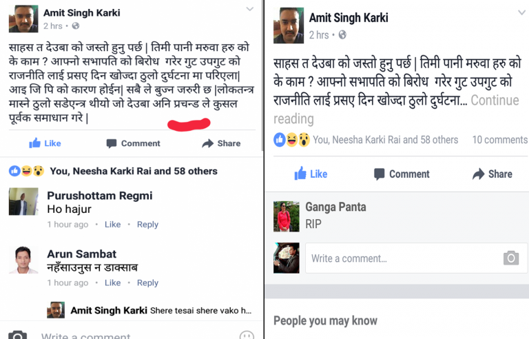 कार्कीले तात्कालीन डिआइजी नवराज सिलवालको प्रयासको वि’रोध गर्दै ओली–प्रचण्ड नि’र्णयको समर्थन गरेका थिए। कार्कीको स्टाटसमा तात्कालीन डिएसपी (हाल एसपी) रहेकी गंगा पन्तले ‘रिप’ भन्दै कमेन्ट गरेकी थिइन् । तिनै पन्तलाई अहिले नेपाल प्रहरीले प्रचण्डको गृहजिल्लामा प्रहरी प्रमूख बनाएर पठाएको छ। यो समाचार लोकपाटि डटकमवाट साभार गरिएको हो ।