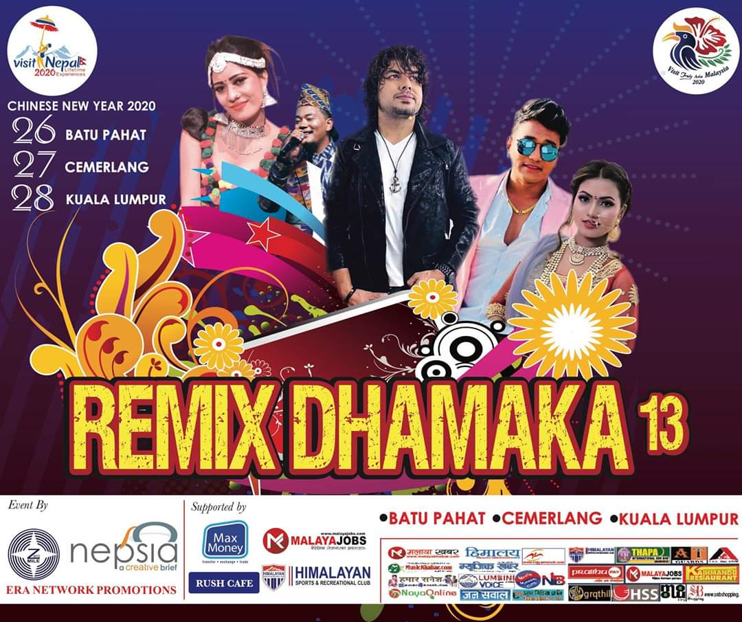 दशैतिहार पछिको चाडहरु ल्होसार,चाइनिज नयाँ बर्षको अबसरमा मलेसियाका तीन ठुला सहरहरुमा नेपाली ख्यातिप्राप्त कलाकार हरुको उपस्थितिमा १३ औं रिमिक्स धमाका हुने भएको छ ।