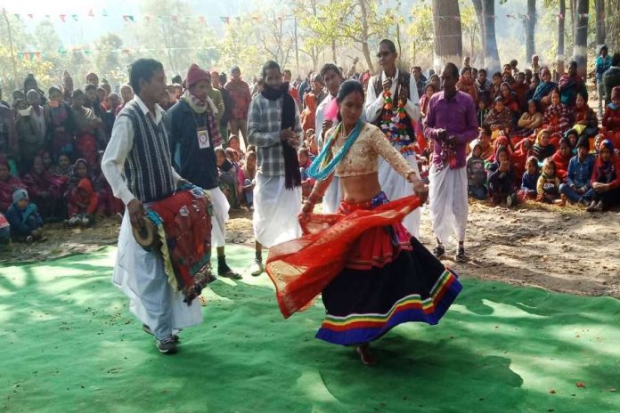 कञ्चनपुर । कञ्चनपुरको शुक्लाफाँटा नगरपालिका( ९ को थारु समुदायको आस्थाको केन्द्र भम्कामा आयोजना गरिएको माघी मिलन कार्यक्रममा झुम्रा नृत्य देखाउदै थारु समुदायका महिला पुरुष ।