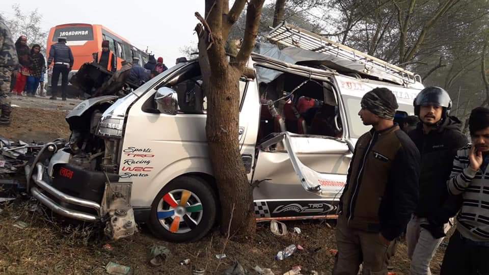 आईतवार बिहान ७ः ३० बजे तित्रिवन स्थित मैदा फयाक्ट्री नजिकै दुर्घना हुन पुगेको छ । ओभरटेक गर्न खोज्दा सो दुर्घटना हुन पुगेको प्रहरीको भनाईरहेको छ । पुर्वबाट काठमाण्डौ जादै गरेको बा ५ ख ३१५७ नम्बरको हायसले सोही दिशाबाट जादै गरेको अर्को हायसलाई ओभरटेक गर्न खोज्दा पश्चिम तर्फबाट आउदै गरेको ना ६ ख ७९५ नम्बरका रात्रिबसमा ठोकीदा दुर्घटना भएको प्रहरीले बताएका छन् । दुर्घटना ग्रस्त हासयको बडी अगाडीबाट आदिभाग कुचिएको अवस्थामा रोड भन्दा तल रुखमा अडिएको अवस्थामा छ । रात्रि बस भने रोड भन्दा केही तल गएको देखिन्छ ।
