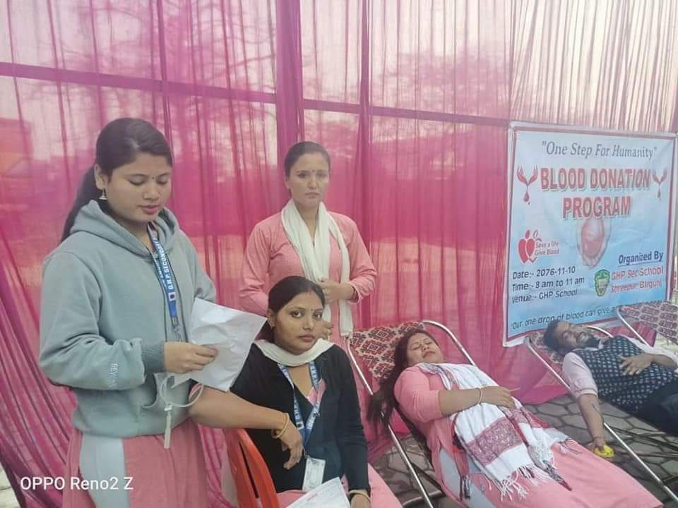जियचपी स्कुल द्वारा आयोजना गरेको रक्तदान कार्यत्रममा १८ महिला सहित ७१ जना रक्तदान गरेका छन् । स्कुल को प्रांगण मा सो रत्तदान कार्यक्रम सम्पन्न भएको हो । कार्यक्रम को प्रमुख अतिथि गोपाल केडिया रहेका थिए।