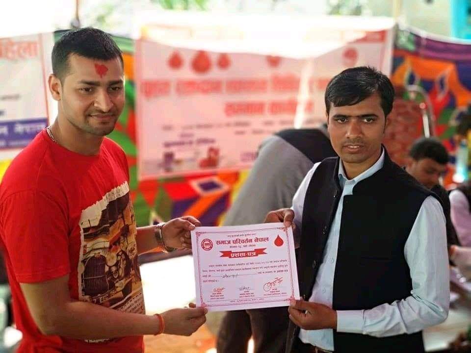 समाज परिवर्तन नेपाल संस्थाले समाजिक उतरदायित्वलाइ ध्यानमा राख्दै आज रक्तदान,निशुल्क स्वास्थ्य शिबिर र समाज रहेका एकल महिलाई समान कार्यक्रम सम्पन्न गरेको छ ।
