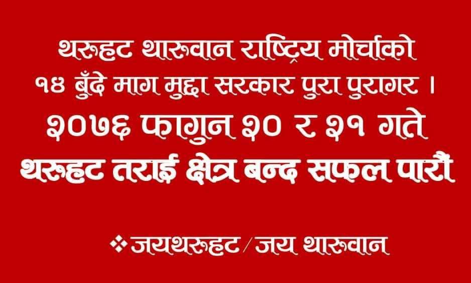 कैलाली:= थरुहट–थारुवान राष्ट्रिय मोर्चाले यहि फागुन २० र २१ गते सशक्त आमहड्ताल घोषणा गरेको छ ।सरकारसंग १४ बँुदे माग राख्दै आन्दोलनरत मोर्चाले सरकारलाई दबाब दिई माग मुद्धा पुरा गराउनका लागि दोस्रो चरणको कार्यक्रम अन्र्तगत २० र २१ गते दुइ दिन शान्तिपूर्ण सशक्त आम हड्तालको कार्यक्रम घोषणा गरेको हो ।