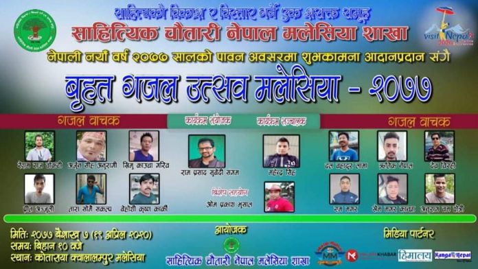 क्वालालम्पुर ( मलेसिया ):= मलेसियाको राजधानी क्वालालम्पुर काेतारायमा नेपाली नया बर्ष २०७७ सालकाे शुभ अवसरमा शुभकामना आदानप्रदान संगसंगै बृहत गजल उत्सव २०७७ आयाेजना हुने भएकाे छ।