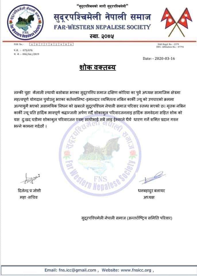 सुदुरपश्चिमेली नेपाली समाज दक्षिण कोरियाका पुर्व अध्यक्ष नबिन कार्कीको बाँकेको कोहलपुर मेडिकल कलेजमा हृदय घातका कारण उपचार क्रममा निधन भएको छ। कैलाली लम्की नगरपालिका ६ स्थायी ठेगाना भएका कार्की १८ महिना अघि स्वदेश फर्कीएका थिए भने केही दिन अघि निधन भएकाे