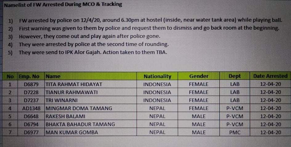 त्यस्तै मोभमेन्ट कन्ट्रोल अर्डर उलंघन गरेको आरोपमा पुनः ४ जना नेपाली पक्राउ परेका छ्न । मलेसियाको मेलाका राज्यभित्र पर्ने मजिस्थानामा रहेको मिनाएक टेक्नोलोजी कम्पनीमा कामगर्ने नेपाली कामदारहरु मिङमार डोल्मा तामाङ (महिला ), मान बहादुर गोम्बा तामाङ , भक्त बहादुर तामाङ , राकेश बालामी लगायत ३ जना ईन्डोनेसियन महिलाहरुलाई एमसिओ उलंघन गरेको आरोपमा प्रहरीले पक्राउ गरेर लगेको मलाका स्थित हाम्रा मलाया खबर सहकर्मीले जानकारी गराउनुभयो ।