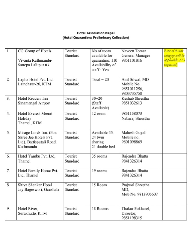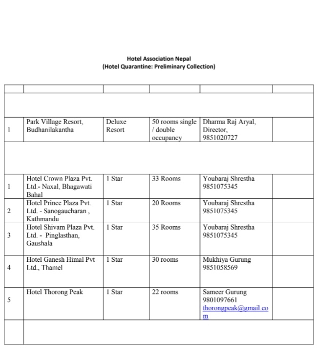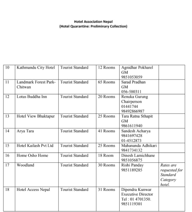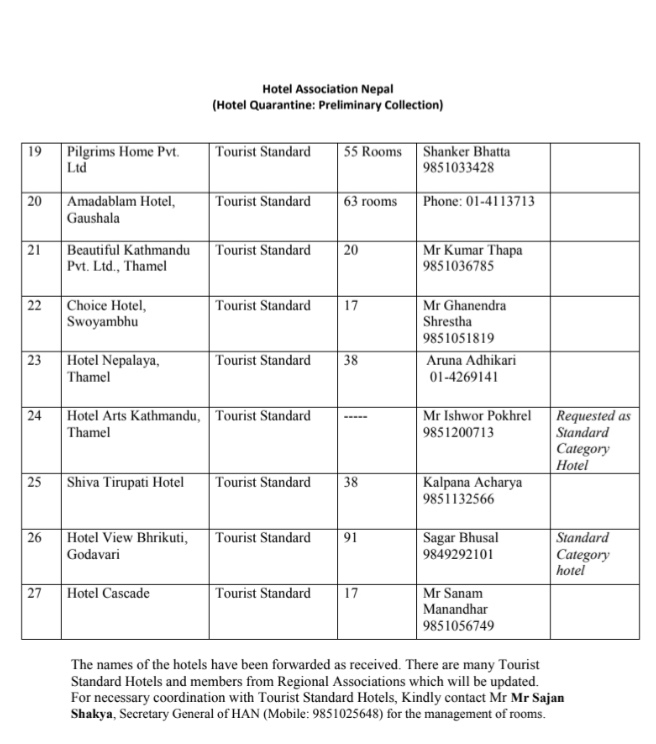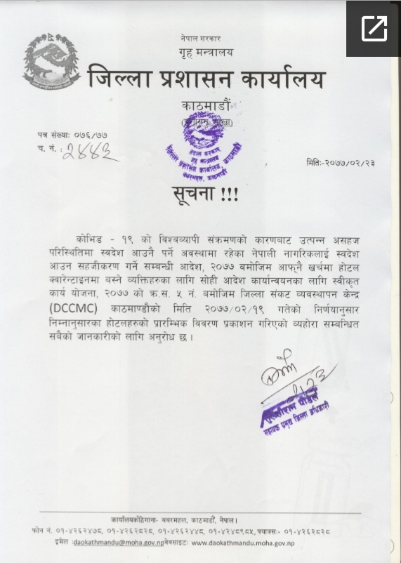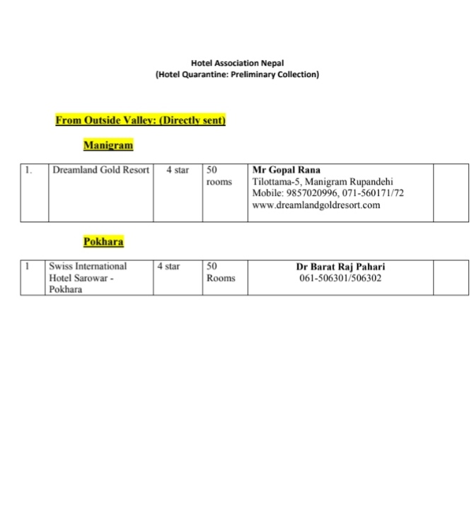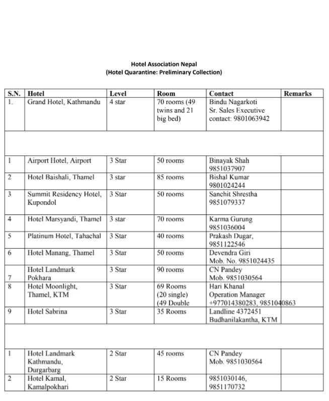 काठमाडौं:= जिल्ला प्रशासन कार्यालय काठमाडौंले विदेशबाट स्वदेश फर्किने नेपालीहरूलाई क्वारेन्टिनमा राख्ने ४७ वटा चारतारे होटलदेखि एकतारे होटेलहरुको सूची सार्वजनिक गरेको छ ।