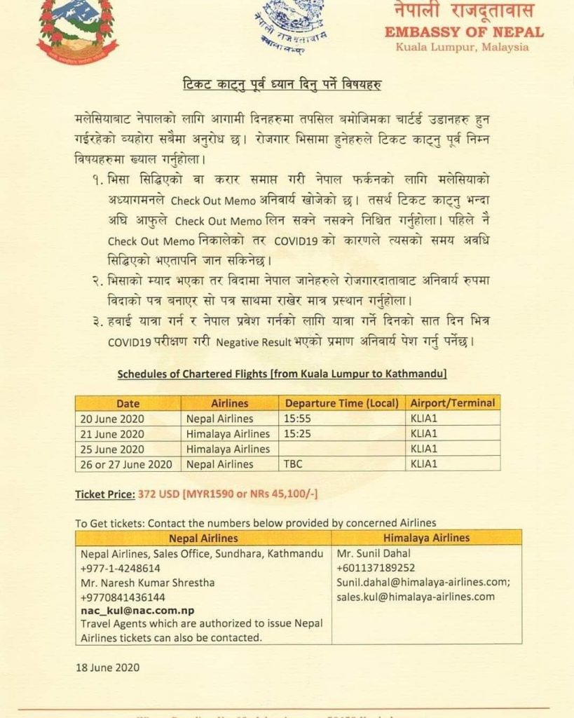 यता स्वदेश फर्किने बिषयमै आधारित आधिकारिक सुचना दूतावासले सार्वजनिक गरेकाछ्न्।हेर्नुहोस दूतावासले जारी गरेको सुचना :