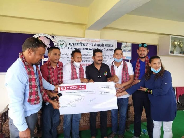 सुदुर पश्चिमेली नेपाली समाजले सोमबार एक कार्यक्रमको आयोजना गरी सुदुरपश्चिम प्रदेशका राष्ट्रिय तथा अन्तर्राष्ट्रिय खेलाडीहरुलाई कोभिड-१९ विरुद्ध एक बर्षे बिमाको लागि नेपाल राष्ट्रिय तथा अन्तर्राष्ट्रिय खेलाडी संघ धनगढी-कैलालीलाई सुदूरपश्चिमेली नेपाली समाजका नेपाल संयोजक चेत बहादुर थापा मार्फत आर्थिक सहयोग हस्तान्तरण गरेको छ ।