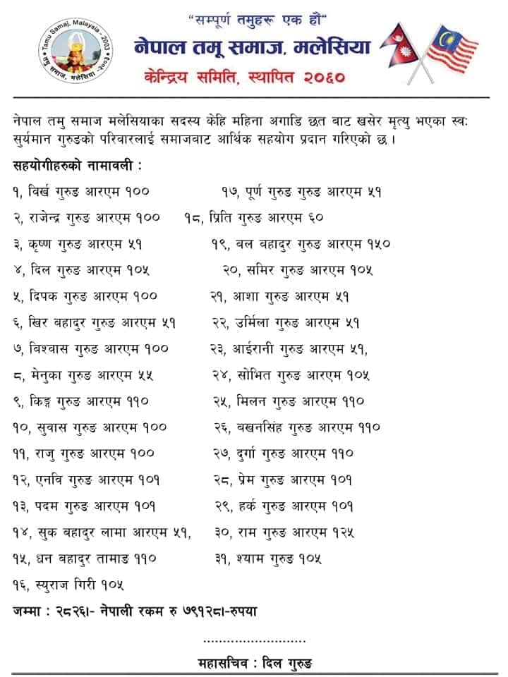 यता उनको परिवारलाई तमु समाज मलेसियाले आर्थिक सहयोग समेत प्रदान गरेको छ । समाजले मलेसियामा कार्यरत विभित्र मनकारी व्यक्तिहरुबाट आर्थिक सहयोग सङ्कलन गरेर आरएम २,८३८ अर्थात नेपाली रुपैयाँ रु.७९,१२८ आर्थिक सहयोग प्रदान गरेको समाजका महासचिव दिल तहार तमुले जानकारी दिनुभयो।