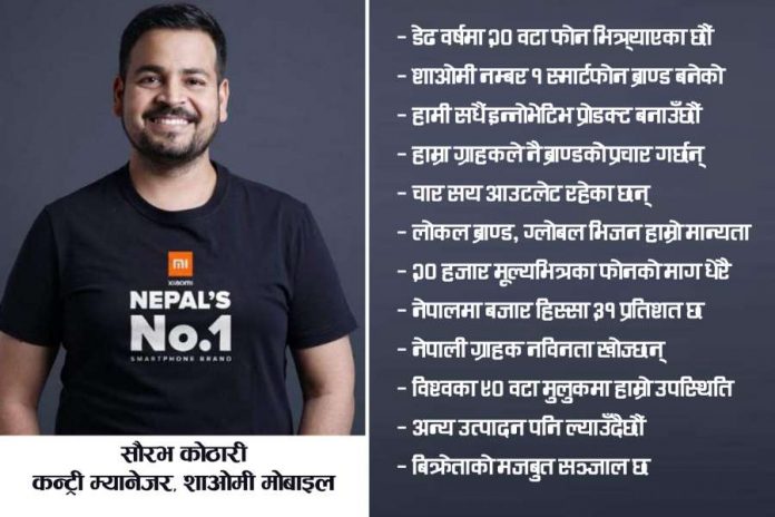 पछिल्लो समय नेपाली बजारमा मोबाइल कम्पनीबीच तीव्र प्रतिस्पर्धा छ । मूल्य र गुणस्तरमा प्रतिस्पर्धा गर्न नसक्ने कतिपय ब्राण्डहरू नयाँ ब्राण्डको प्रवेशसँगै विस्थापित हुने क्रम बढेर गएको छ । नयाँनयाँ ब्राण्डको प्रवेशले उपभोक्तालाई उपयुक्त ब्राण्ड छनौटका लागि सहजता प्रदान गरेको छ । पछिल्लो समय नेपाली बजारमा शाओमी मोबाइलमा उपभोक्ताको आकर्षण देखिएको छ । उपयोगी फिचर्स, उत्कृष्ट क्यामेरा र उचित मूल्यका कारण पनि शाओमीप्रति उपभोक्ताको आकर्षण देखिएको हुनसक्छ । सोही कारण छोटो समयमै शाओमी नेपालमा नम्बर १ ब्राण्ड बन्न सफल भएको शाओमीका नेपालस्थित कन्ट्री म्यानेजर सौरभ कोठारी बताउँनुहुन्छ । त्यसो त शाओमीले छोटो अवधिमा नेपालमा आक्रामकरूपमा बजार विस्तार गरेको छ । शाओमी मोबाइलको लोकप्रियतासँगै कम्पनीले उत्पादनमा विविधीकरण सुरु गरेको छ । सोही क्रममा हालैमात्र कम्पनीले शाओमी राउटर नेपाली बजारमा ल्याएको छ भने इयरफोन, इयर बडलगायतका एसोेसिरज पनि निकट भविष्यमै बजारमा आउने कन्ट्री म्यानेजर कोठारीले बताउनुभएको छ । प्रस्तुत छ, यिन नै विविध विषयमा हिमालय टाइम्सका लेखनाथ पोखरेलले कोठारीसँग गरेको कुराकानीः