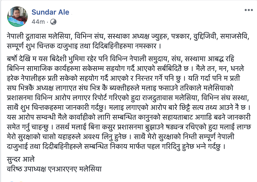 बर्षो देखि म यस बिदेशी भुमिमा रहेर पनि विभिन्न नेपाली समुदाय, संघ, सस्थामा आबद्ध रहि बिभिन्न सामाजिक कार्यहरुमा सकेसम्म सहयोग गर्दै आएको सर्बबिदितै छ । मैले तन, मन, धनले हरेक नेपालीहरु प्रती सकेको सहयोग गर्दै आएको र निरन्तर गर्ने पनि छु । यति गर्दा पनि म प्रती सघ भित्रकै अध्यक्ष लागाएत संघ भित्र कै ब्यक्तीहरुले मलाइ फसाउने तरिकाले मलेसियाको प्रशासनमा विभिन्न आरोप लगाएर रिपोर्ट गरिएको हुदा राजदुतावास मलेसिया, विभिन्न संघ सस्था, साथै शुभ चिन्तकहरुमा जानकारी गर्दछु। मलाइ लगाएको आरोप बारे छिट्टै सत्य तथ्य आउने नै छ । यस आरोप सम्वन्धी मैले कार्वाहीको लागि सम्बन्धित कानुनको सहायताबाट अगाडि बढने जानकारी समेत गर्नु चाहन्छु । तसर्थ मलाई बिना कसुर प्रशासनमा बुझाउने षड्यन्त्र रचिएकाे हुदा मलाई लाग्छ मेराे सुरक्षाकाे चासाे यहाहरुले अवश्य लिनु हुनेछ । साथै मेराे सुरक्षाकाे निम्ती सम्पूर्ण नेपाली दाजुभाई तथा दिदीबहिनीहरुले सम्बन्धित निकाय मार्फत पहल गरिदिनु हुनेछ भन्ने गर्दछु ।